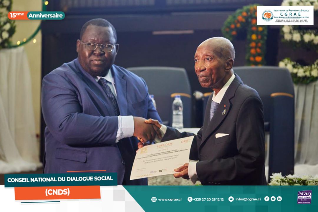 Le jeudi 20 juillet 2023, le 15ème anniversaire du Conseil National du Dialogue Social (CNDS) a été célébré sous la présidence de Monsieur le ministre de l’Emploi et de la Protection Sociale, Maître KAMARA ADAMA, représenté par son Inspecteur Générale M. Ebenezer AGOH avec comme invité d’honneur le Ministre de la Cohésion Sociale, M. KOUADIO KONAN BERTIN dit KKB. Cette cérémonie commémorative a été marquée par la présence des Institutions de Prévoyance Sociale (la CGRAE et la CNPS), des représentants des secteurs publics et privés, des syndicats des employeurs et des organisations de la société civile. C’était l’occasion de revenir sur les réalisations du CNDS en Côte d’Ivoire ainsi que sur la valeur que revêt cette Institution dans notre pays.