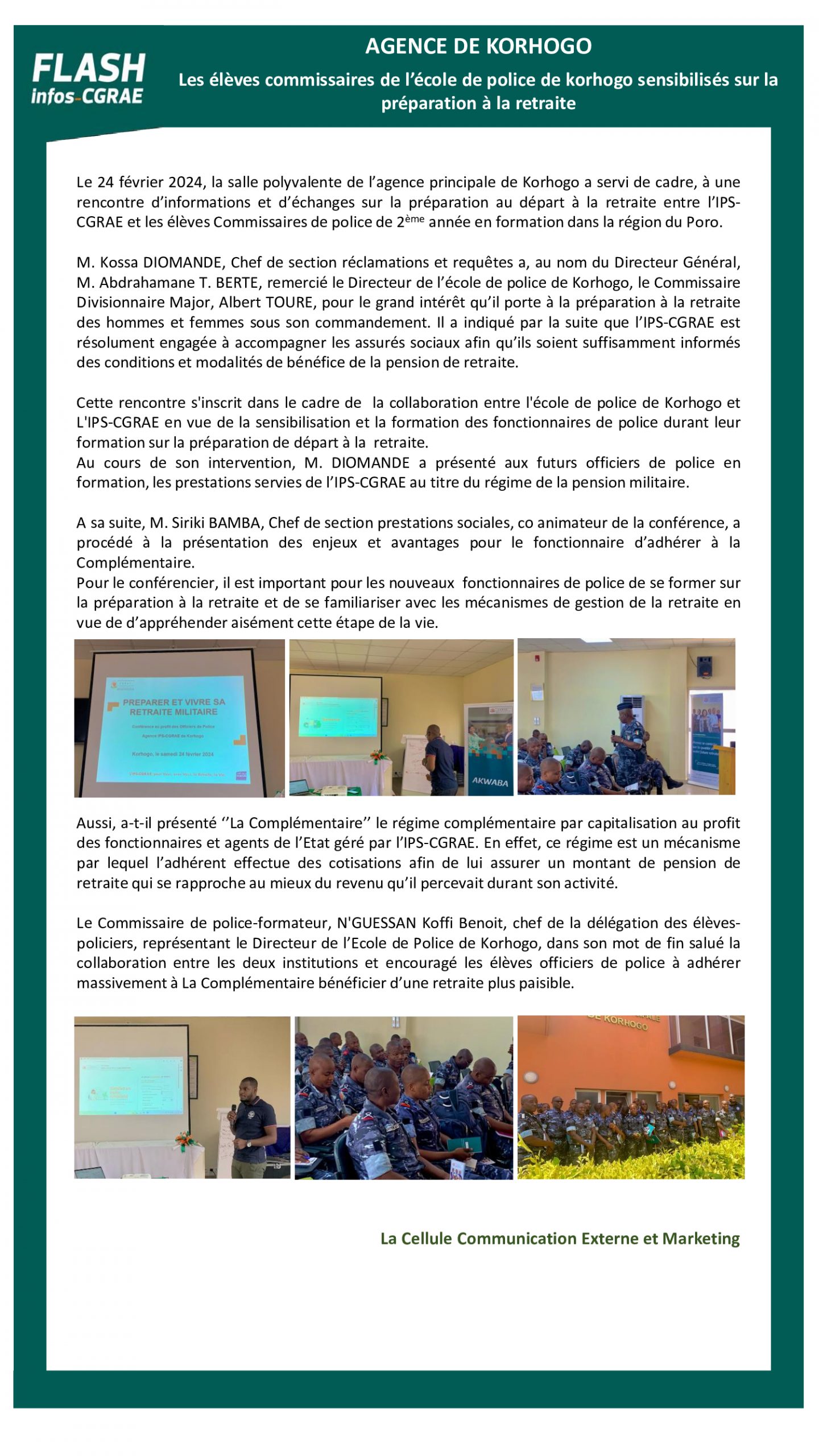 Les élèves fonctionnaires de l’école de police KORHOGO sensibilisés sur les enjeux de la préparation à la retraite