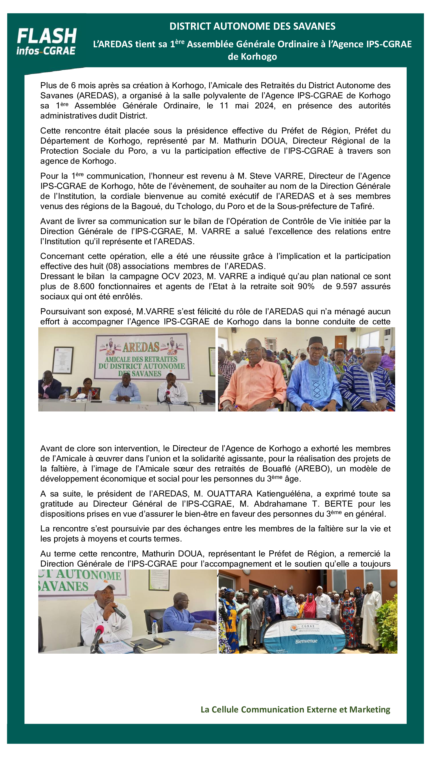 DISTRICT AUTONOME DES SAVANES L’AREDAS tient sa 1ère Assemblée Générale Ordinaire à l’Agence IPS-CGRAE de Korhogo