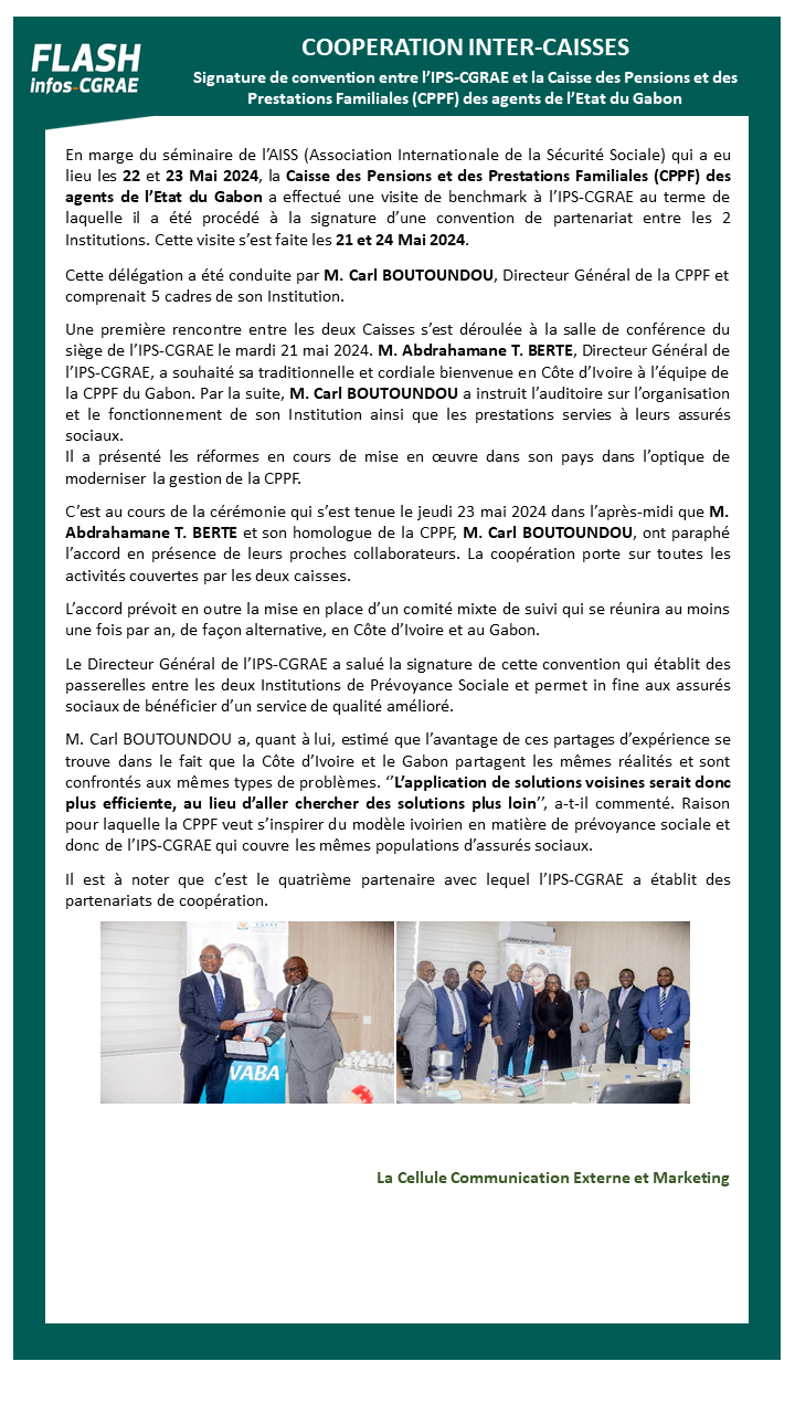 HomeNewsActualitésCoopération inter-caisses: Signature de convention entre l’IPS-CGRAE et la Caisse des Pensions et des Prestations Familiales (CPPF) des agents de l’Etat du Gabon