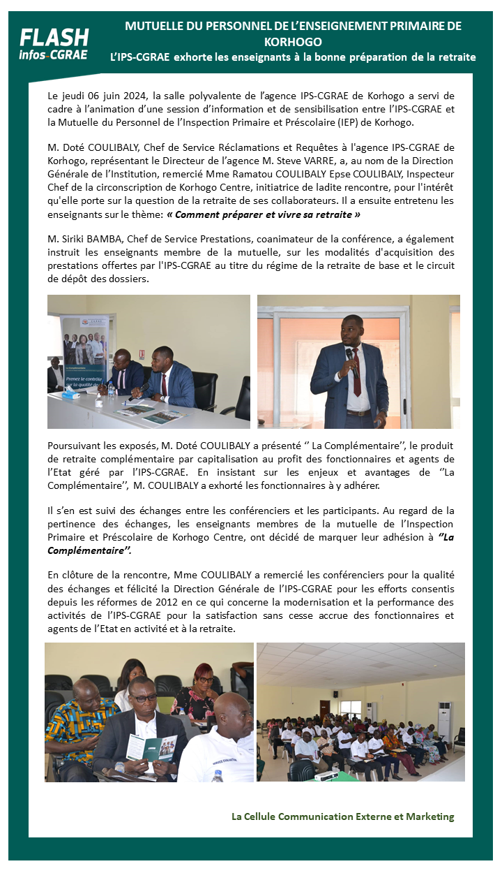 Mutuelle du personnel de l’enseignement primaire de Korhogo Centre l’IPS-CGRAE exhorte les enseignats à la bonne préparation de la retraite
