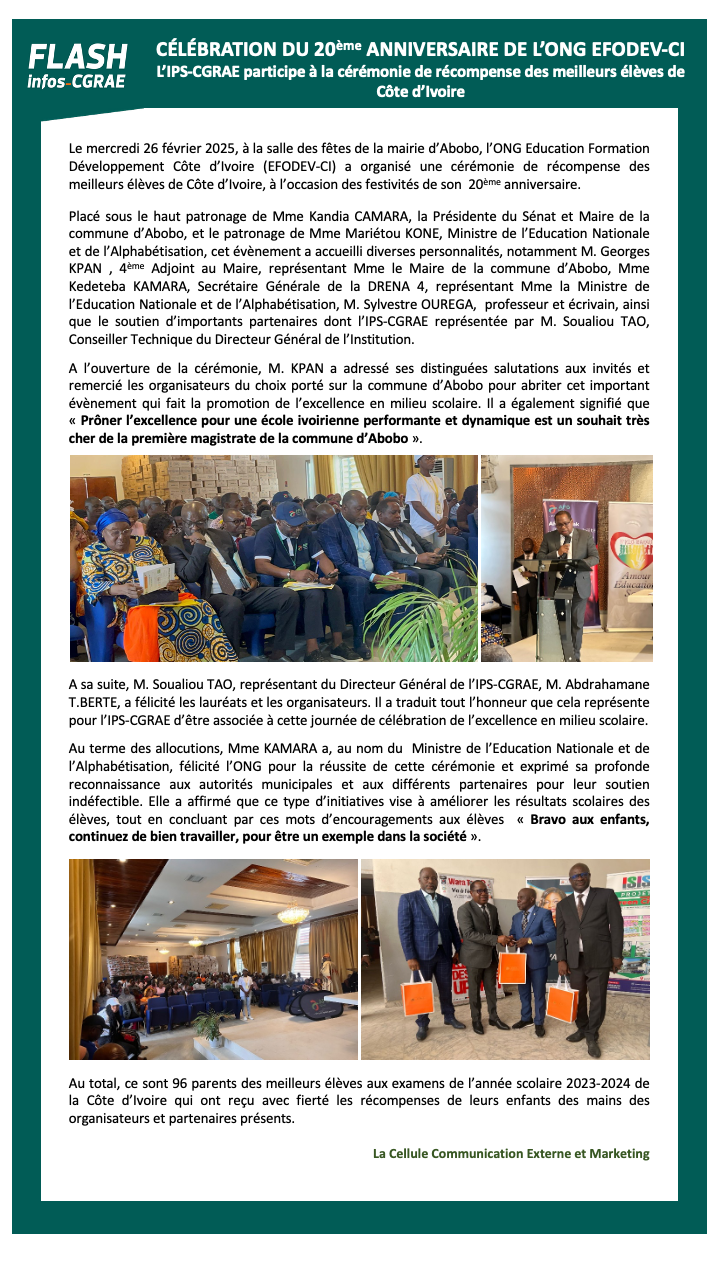 Célébration du 20ème Anniversaire de l’ONG EFODEV-CI L’IPS-CGRAE participe à la cérémonie de récompense des meilleurs élèves de Côte d’Ivoire