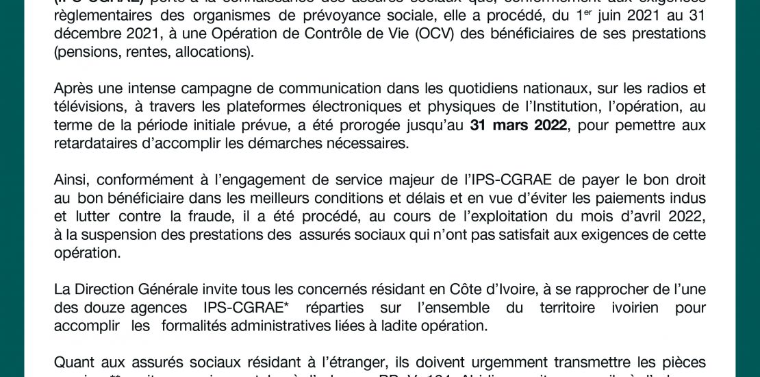 Communiqué relatif au report de la date de l’opération de contrôle de vie 2021